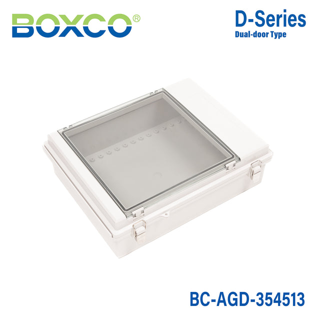 Boxco Dual Door Enclosure, 350 mm Width x 450 mm Length x 130 mm Height (9.84" x 13.78" x 6.3"), ABS Plastic, Hinge built-in, Stainless steel latches, Cover is detachable for better access, Integrated key ring, -40 C to 86 C (-40 F to 185 F), Rated IP 66/67, NEMA 4X/6X, UL94-HB Non-Flammable, Impact test: IK07/08, TUV, RoHS