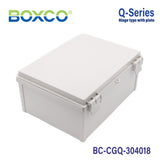 For Boxco Q-Series,Ultraviolet Stabilizer is added to protect the enclosures for outdoor usage. Few colour changes will be noticed even after a long time of use. Anti-static material is used to protect sensitive electronic instruments from static electricity. It is made of high impact resistant material which is very strong against external impact and also prevents breakage during hole and press processing. Special spec can be added besides standard specification. We can supply optimized products with the spec and material you choose.