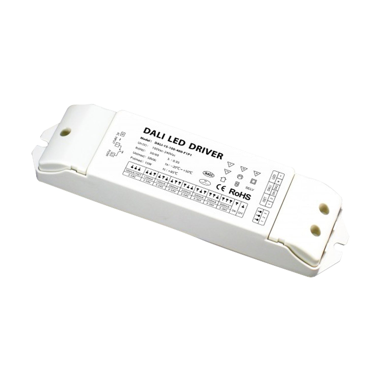 PWM digital dimming, no alter LED color rendering index. Standard DALI logarithmic dimming curve. Dimming range: 0~100%, LED start at 0.1% possible. Multiple current, wide voltage, compatible with a variety of LED lights. Power factor > 0.99, Efficiency > 83% Short circuit / Over-heat / Over load protection. Class 2 power supply. Full protective plastic housing. DALI bus standard: IEC62386-101, 102, 207. Compliant with Safety Extra Low Voltage standard. Suitable for indoor environments.